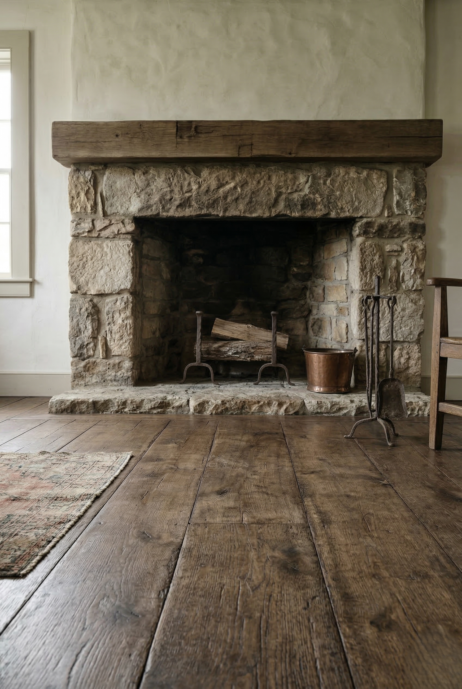 From limestone hearths to textured plaster walls, earth-based materials bring a sense of permanence. They provide a cool, matte contrast to the warmth of wood, creating the balanced “Modern Rustic” look.
