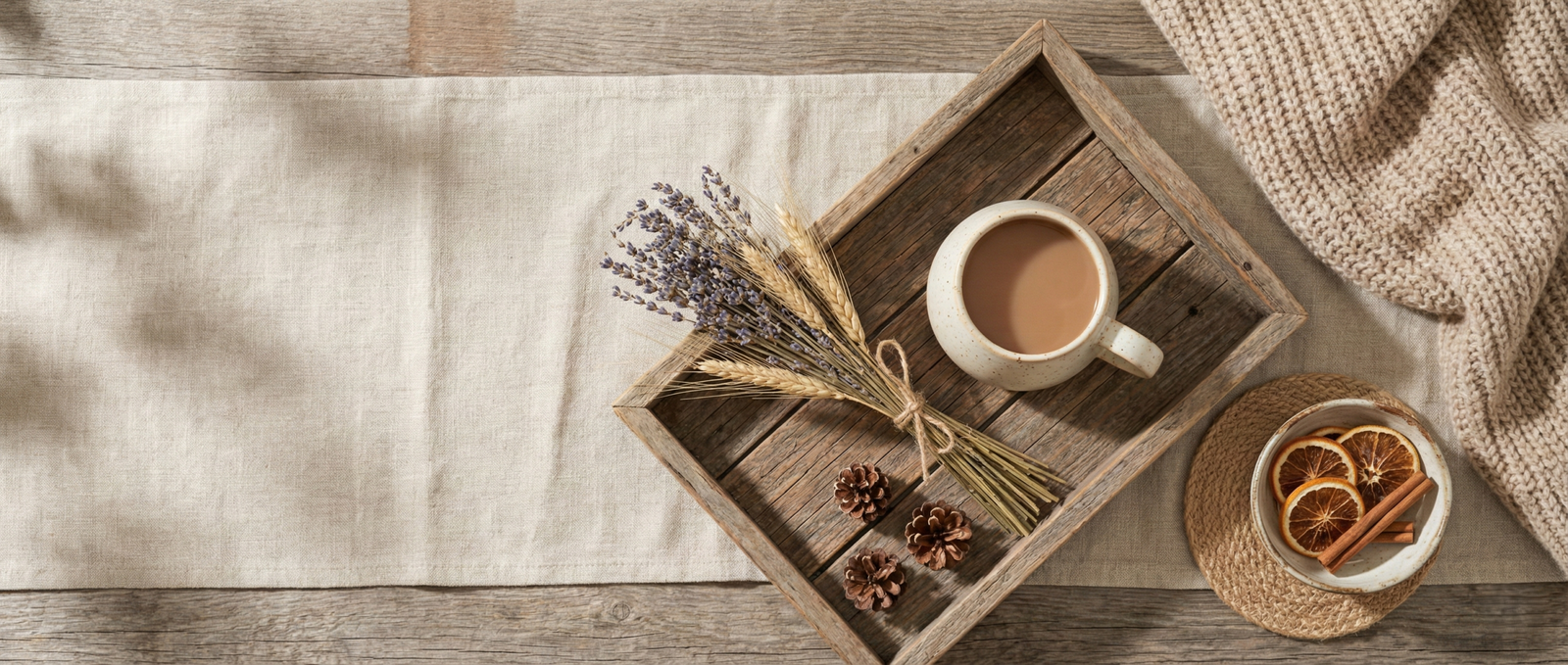Cozy Rustic Living begins with the raw, imperfect beauty of nature. Think warm woods, stone textures, woven baskets, linen fabrics, and handmade ceramics.