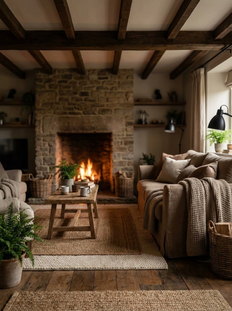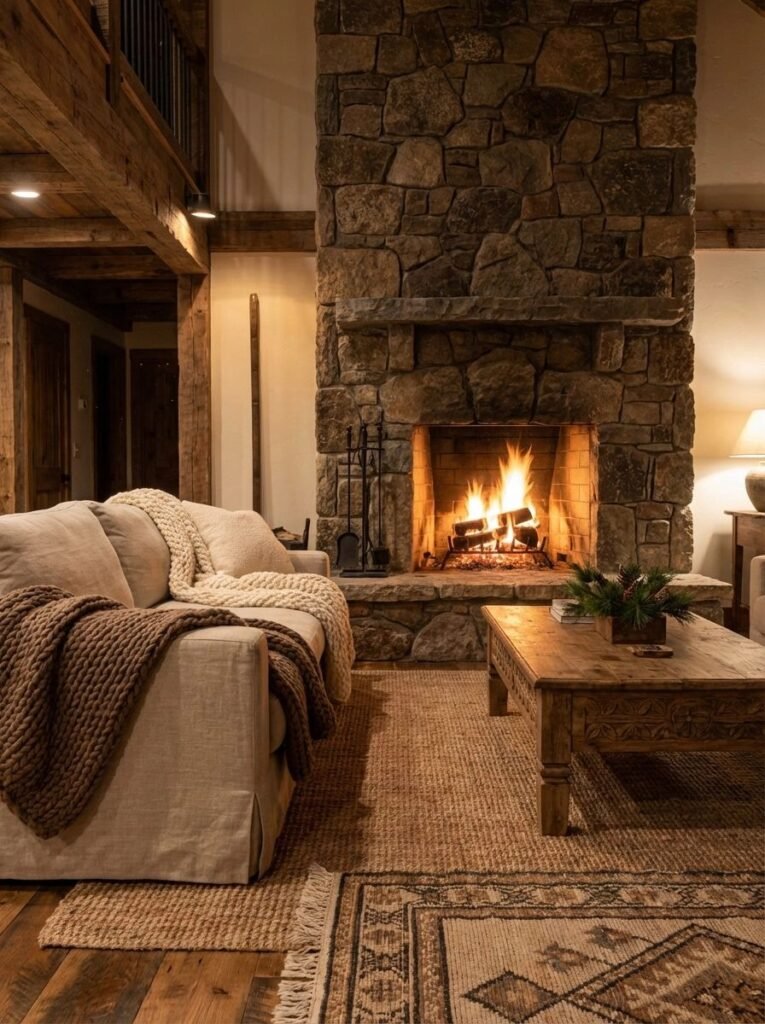 Stone fireplaces, linen curtains, wool blankets, and clay or ceramic accents add layers of authenticity and warmth.