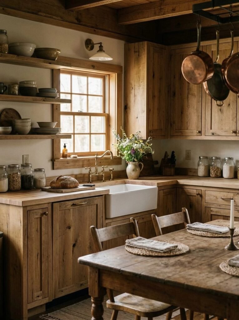 Cabin kitchens combine charm with practicality. Open shelving, wooden countertops, vintage-inspired fixtures, and simple layouts define the space.